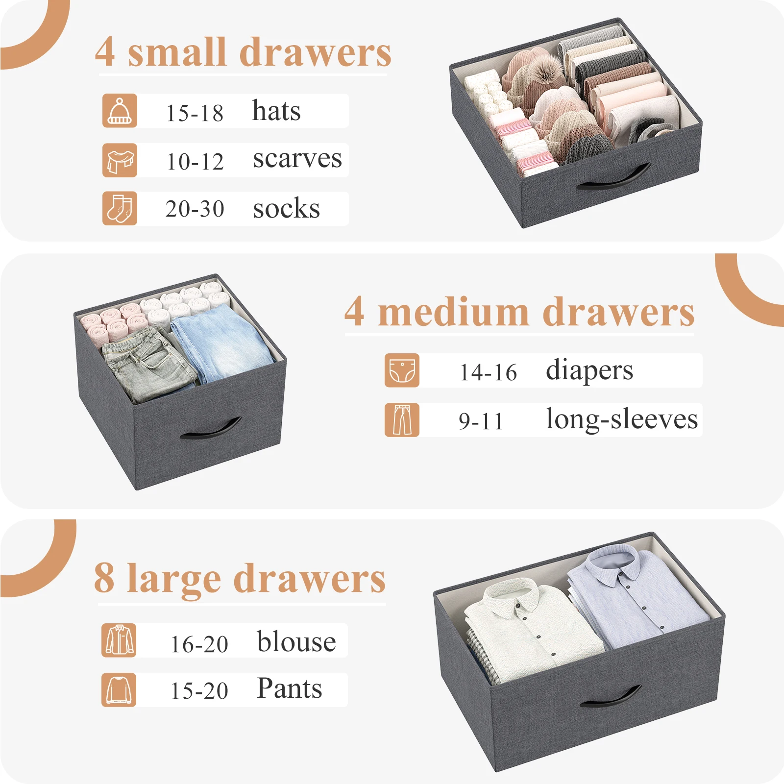 【3 TRPES OF DRAWERS CAN BE CLASSIFIED FOR STORAGE】: We offer 3 types of drawers for classified storage. 4 small drawers organizer can be used to store your underpants, underwear, socks, etc., 4 medium drawers can be used to store your scarves, diapers, long sleeves, etc., and 8 large drawers can be used to store shirts, sweaters, etc