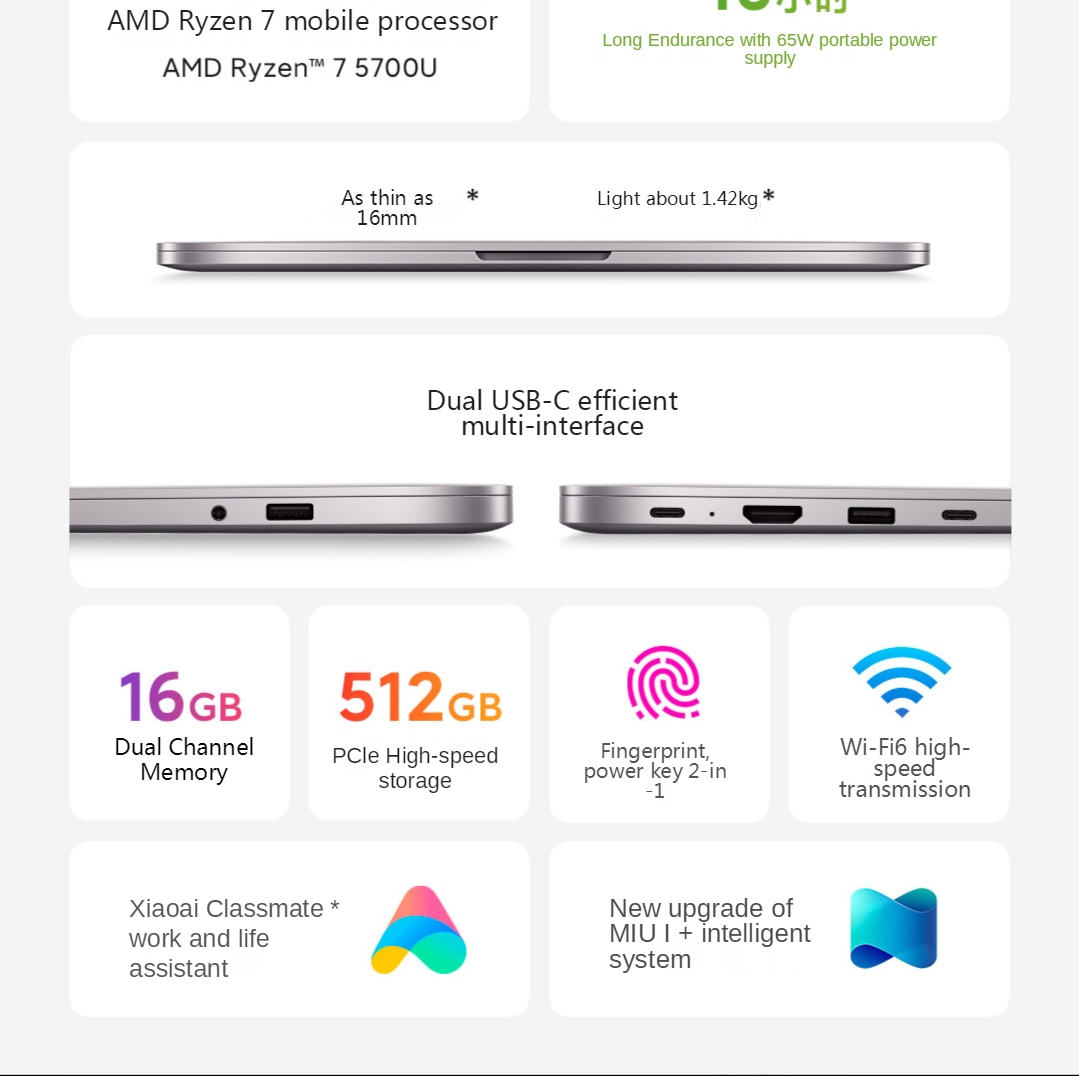 New Xiaomi RedmiBook Pro 14 Laptop AMD Ryzen 5700U /5500U Processor 16GB DDR4+512GB SSD 2.5K Super Retina Full Screen Notebook