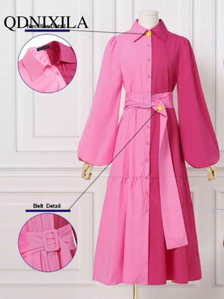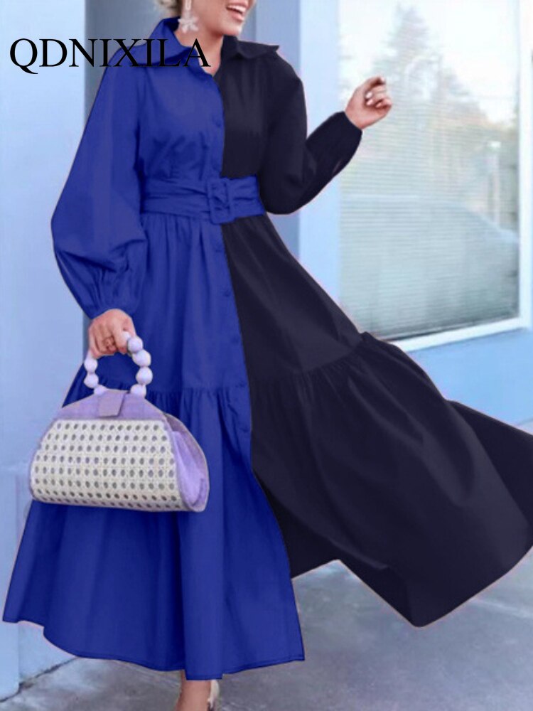 New Elegant Hit Color Dress For Women Lapel Lantern Long Sleeve High Waist Sashes Slim Maxi Dresses Females Spring Fashion Style