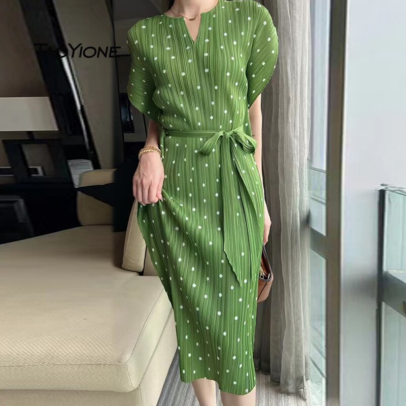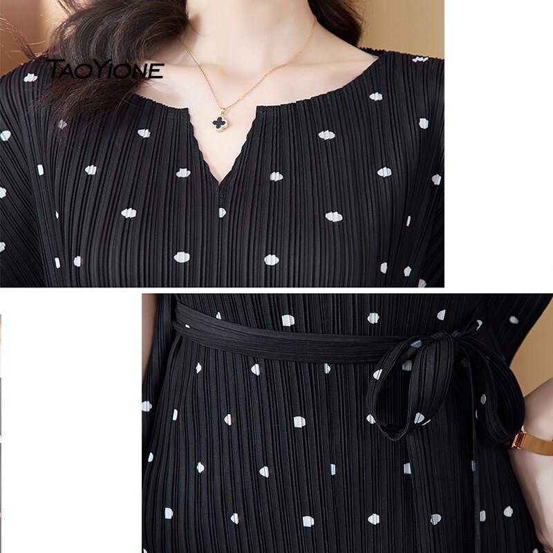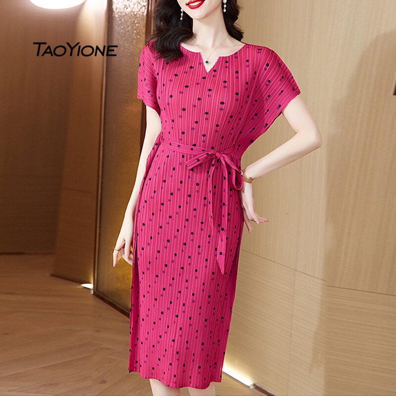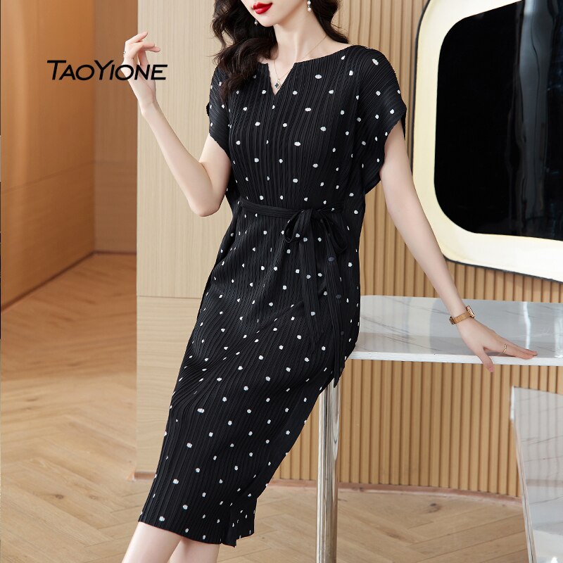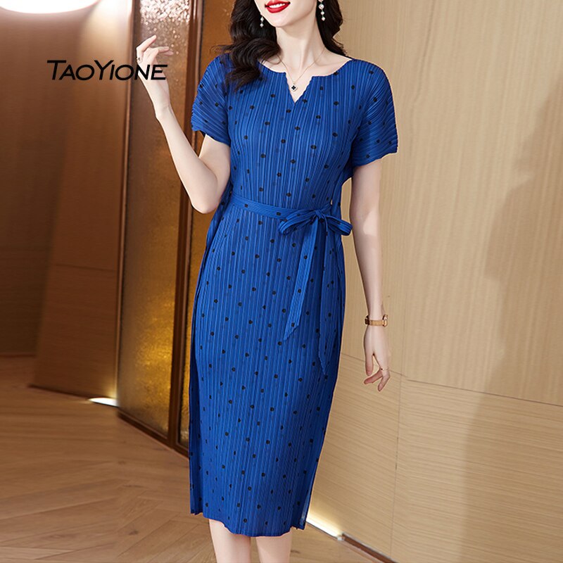 2023 Vestidos Vintage Sweet Chiffon Dot Printed Elegant Summer Pleated Midi Short Sleeve Dress Female Robe Women's Lady Dresses