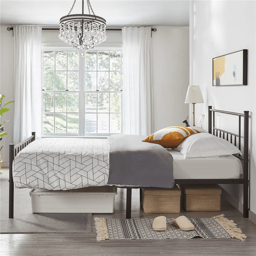This bed base features a black/white/silver finish metal slat frame. The headboard and footboard take spindle design, adding beautiful decorative details to the frame. The iron frame features premium powder coating for scratch- and rust resistance. Make cleaning a breeze, wipe clean with a damp cloth and a mild cleaner. Besides, the spacious storage space under the bed makes the room tidy and clean-ideal for teenagers rooms, guest rooms, dormitories, apartments, and all kinds of bedrooms.