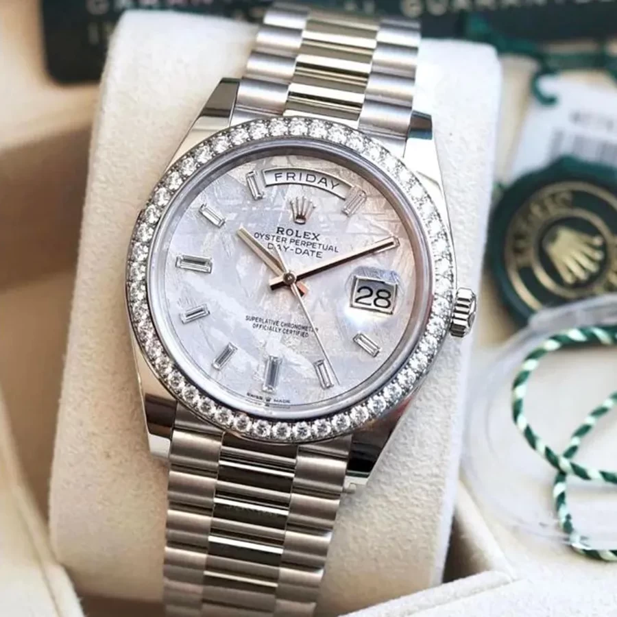 Hoàn thiện bằng bộ vỏ Oyster vàng trắng 18K tạo cảm giác “đầm” tay, đem đến những trải nghiệm sử dụng thật sự đẳng cấp và khác biệt. Sự kết hợp giữa mặt số tròn và dây đeo President 3 khớp nối mảnh, thiết kế bộ khóa gấp chắc chắn giúp ôm gọn vào cổ tay người dùng, tạo nên dấu ấn riêng của thương hiệu lâu đời.