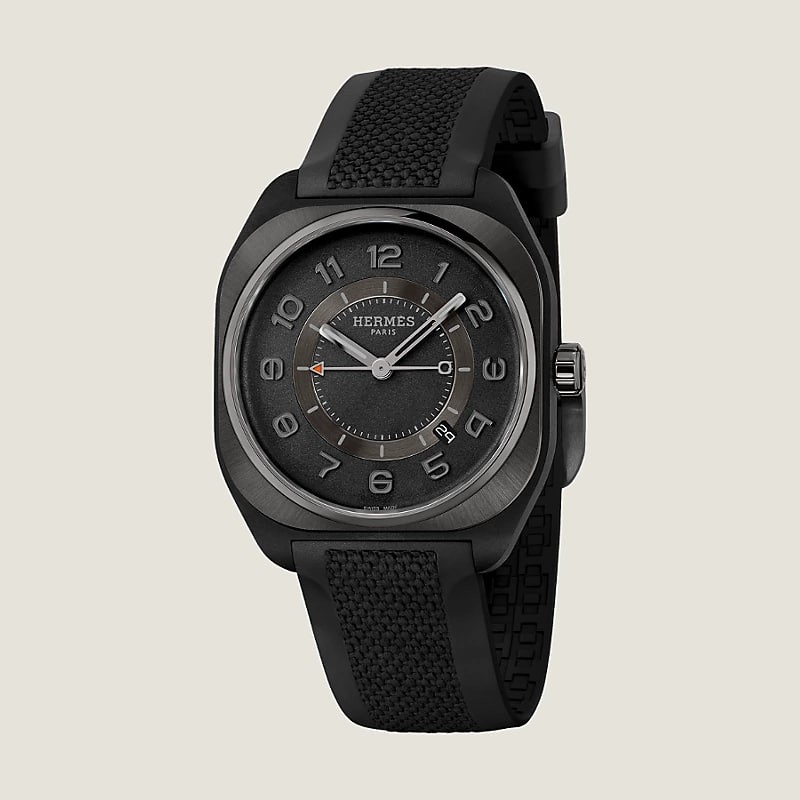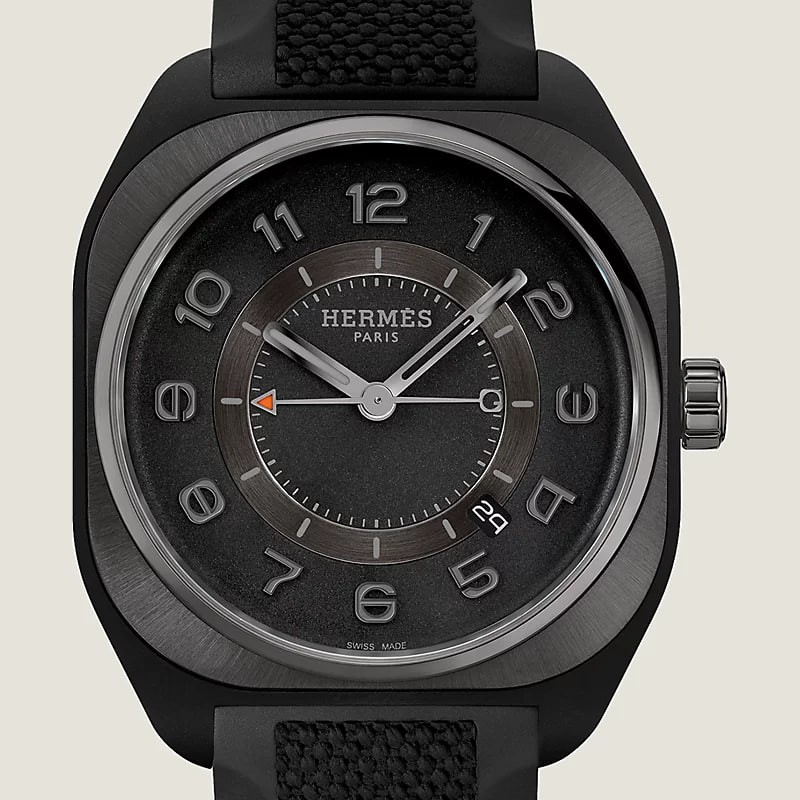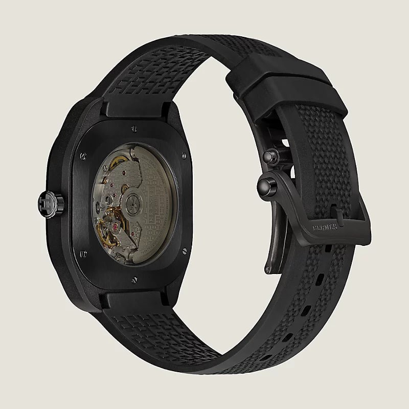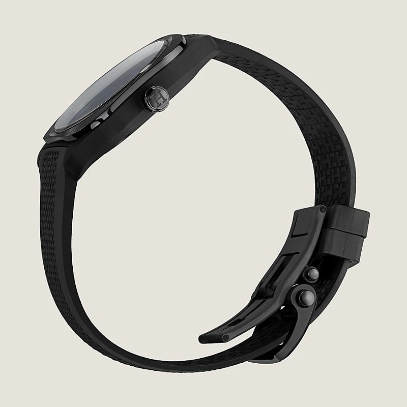 Graphene composite watch with radial satin matte ceramic bezel, mirror-polished chamfer, grey pad dial with in-house Hermès calibre, black-plated gold dial, grain pattern in the centre, black rubber strap.