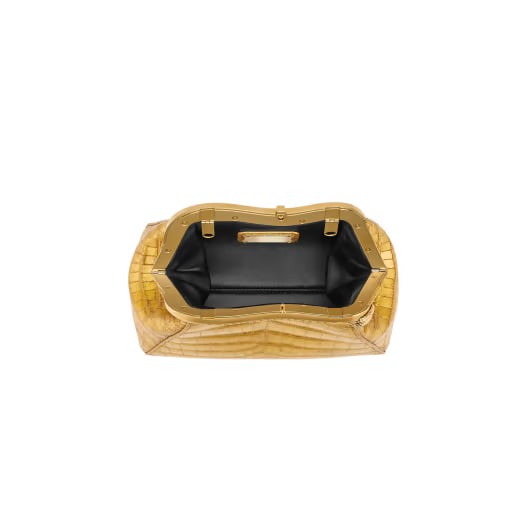 The precious Serpentine series small clutch bag is handcrafted from golden soft crocodile leather and cleverly decorated with 24K gold foil, which is in line with Bulgari’s jewelry style. The handbag combines soft and fashionable shapes with jewelry element details, which are reminiscent of the graceful and agile posture of the snake, boldly interpreting timeless and classic style. Inspired by the bold and unruly Serpenti series antique archival necklace of the 1960s, its gold-plated brass snake-shaped frame is made of 3-micron plated 24K gold, a special tribute to Bulgari's gold decoration craftsmanship. The handbag embodies a variety of styles - a curved metal top, engraved scales on the front and red enamel eyes, elegant and charming; glossy crocodile leather inserts on the back for a casual style. Featuring a single compartment with snap-button closure and leather shoulder strap, a metal plaque on the inside engraved with the Bulgari logo and the Bulgari metal logo on the back. 19.5 x 14 x 10 cm - 7.7 x 5.5 x 3.9 inches. made in Italy.